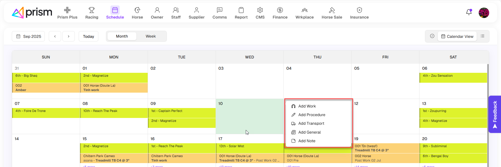 You can add tasks from within a calendar date which can help provide a visual cue when preparing a horse’s campaign or working with procedures and clear day guidelines.
