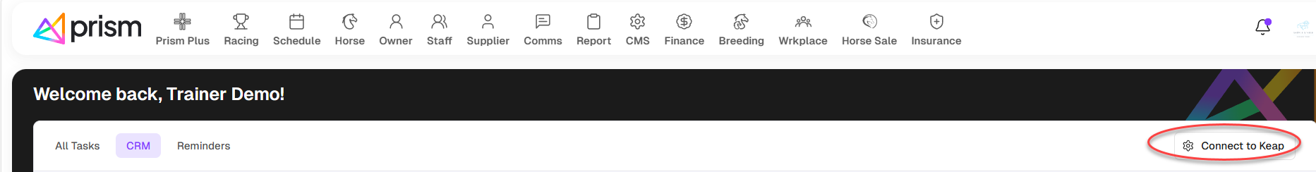 When the you opens Dashboard > CMR, click on button Connect to Keap to sync data to Keap and hook data from Keap to Prism.