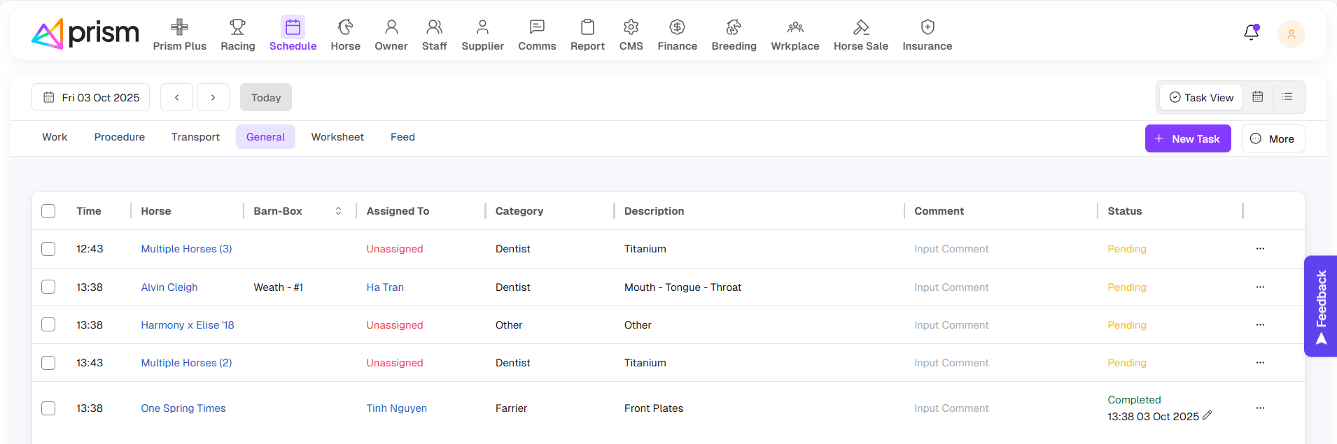 List data is ordered by status (Pending → Completed → Cancelled). Within the same status, tasks are sorted by time, and then by horse name if the time is identical.