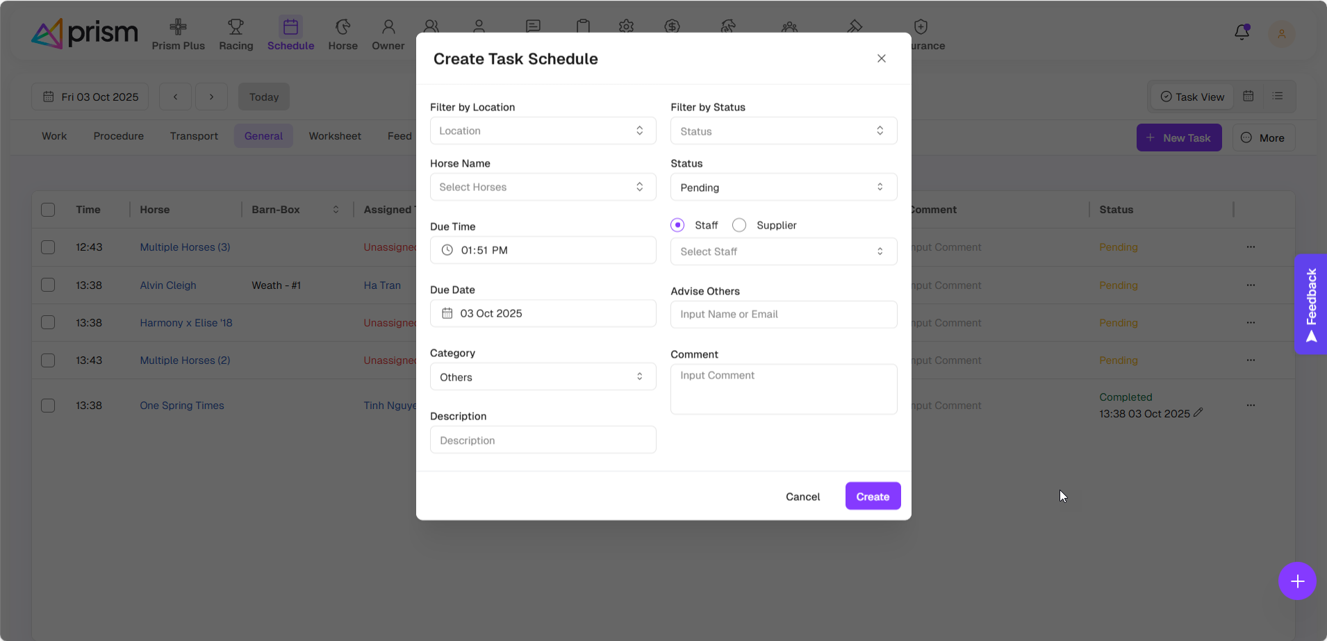- System will update the calendar, schedule, horses task history and the staff’s task list (if required)