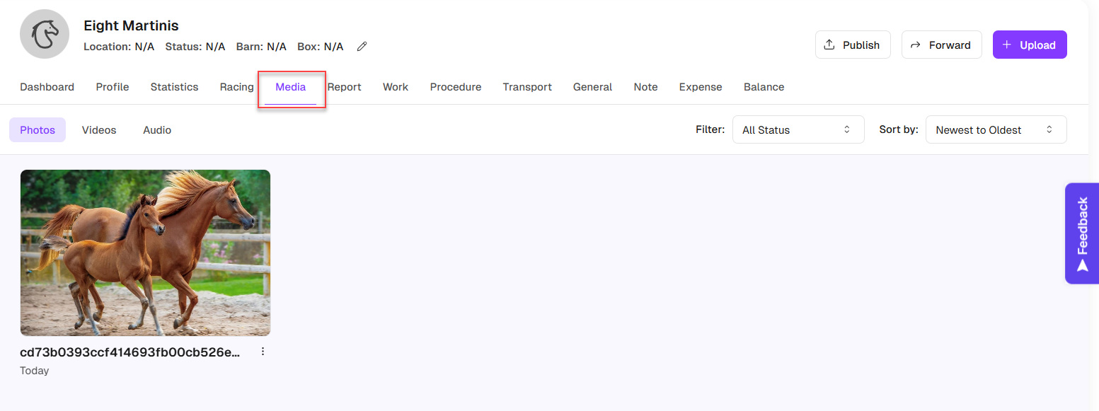 From Horse page, you click on one horse then go to Media tab. In Media tab, you click on Photo then the system will show all photos and albums uploaded, running from the latest to oldest.