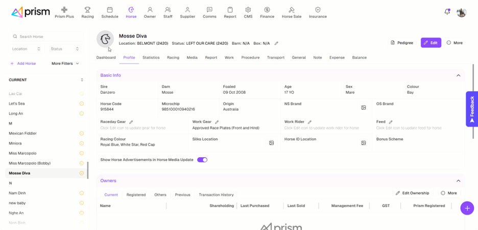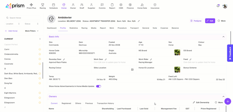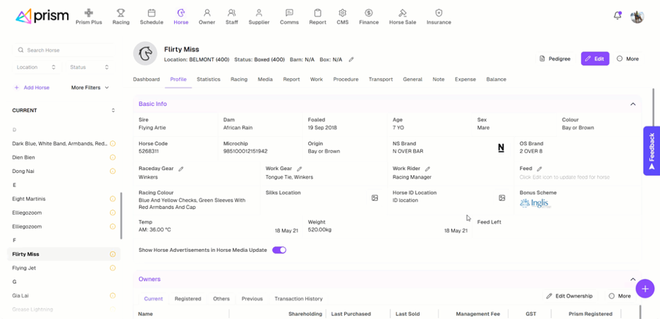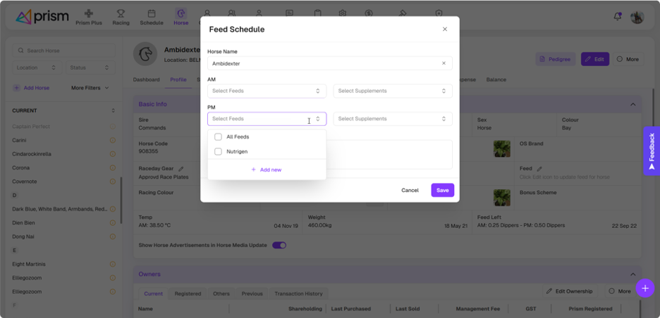 Subscribers to Prism PLUS can now maintain a Feed and Supplements for each horse.