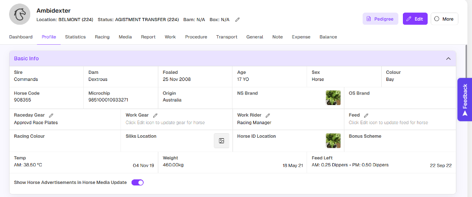 In this section you can see the basic information of the horse: Sire, Dam, Foaled, Age, Sex, Horse Code, Microchip,....