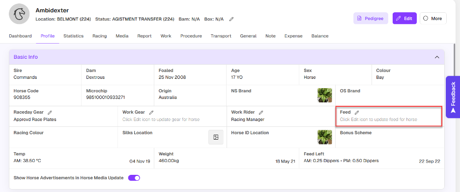 On the Horse Profile, click in the Feed box to maintain the default Feed(s) and Supplement(s) for each Feed Time.