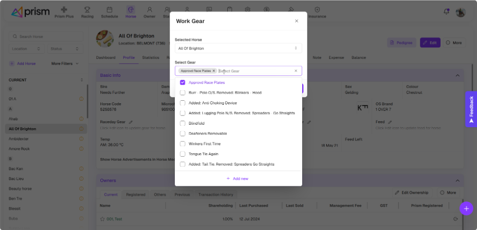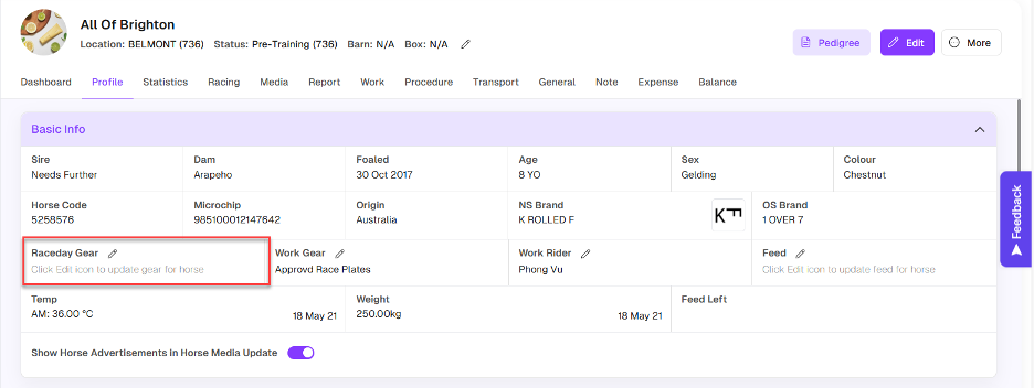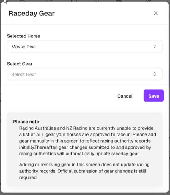 The gear assigned to your racehorse will automatically update upon Gear Changes being recorded in the daily race nominations and acceptances data we receive from Racing Authorities and other racing data suppliers.