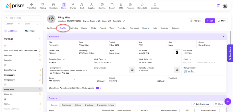 Go to the Horse > Profile tab to see the profile of the horse you need.