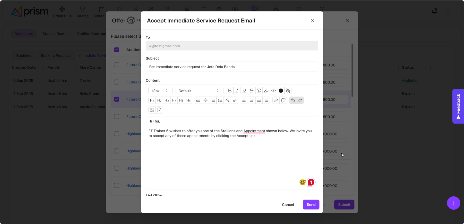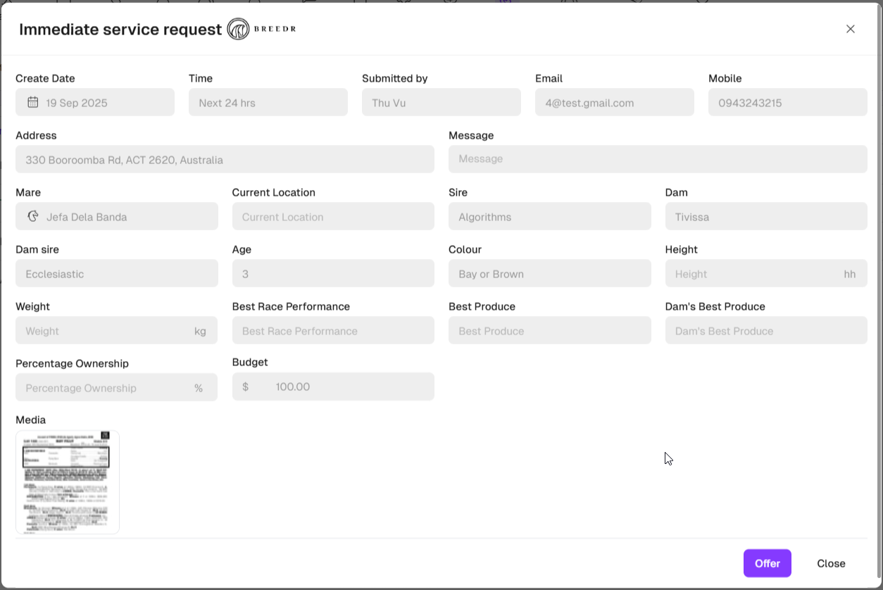 All Immediate Service requests will be displayed on this page and details will be provided for the Studmaster to contact the mare owner. The Immediate Service status will be available until it expires (24/48 hours).