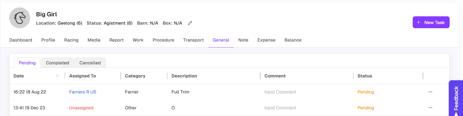 You can also view and maintain a horse’s tasks via their individual profile page. To view each task, simply click on the relevant task (trackwork, procedures, transport or general) to display the pending, completed or cancelled Task.