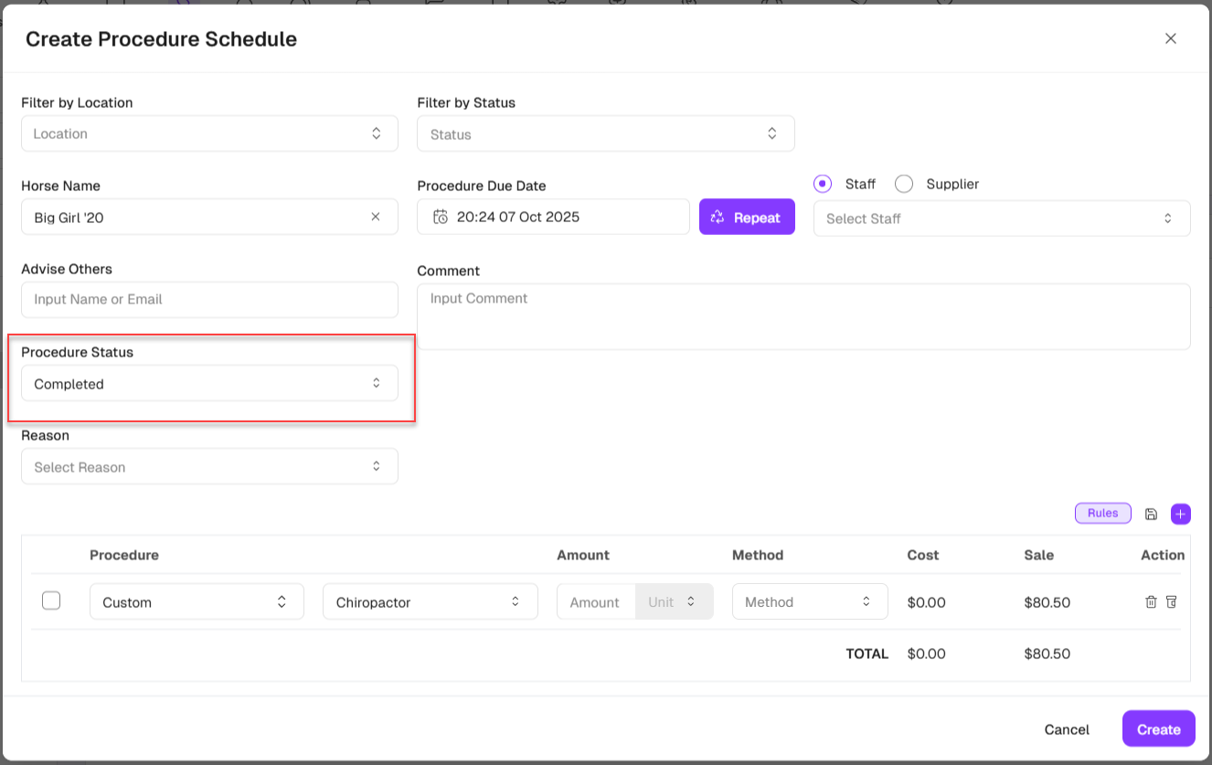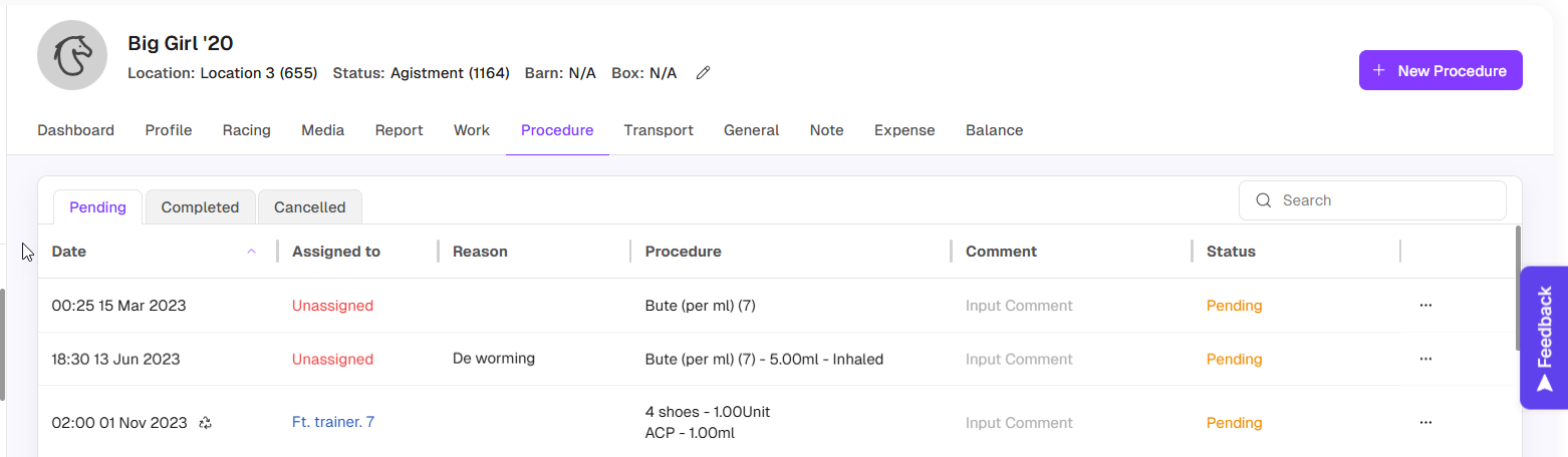 Go to Horse > Procedure tab to access the page. On this page you will see the horse's procedure tasks divided into tabs corresponding to 3 statuses. You can manage procedural tasks for each specific horse including: