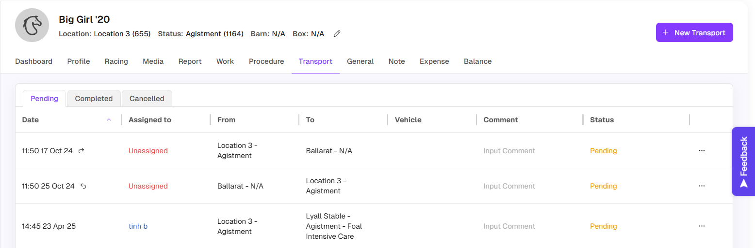 Go to Horse > Transport tab to access the page. On this page you will see the horse's general tasks divided into tabs corresponding to 3 statuses.You can manage transport tasks for each specific horse including:
