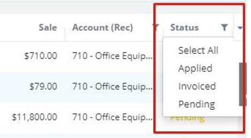 By default, all transactions viewed are 'pending', meaning they have not been invoiced yet. To view all transactions including “Invoiced” ones, select the Status column to be viewed and then apply a filter on that column.