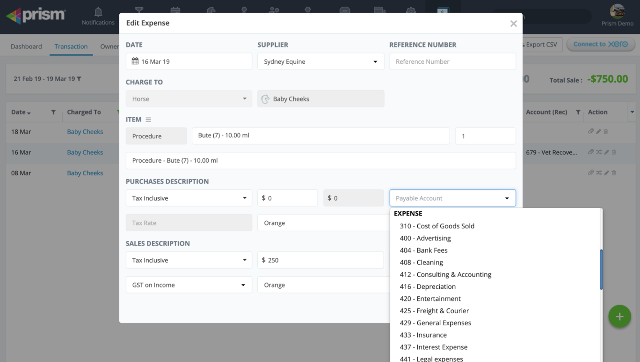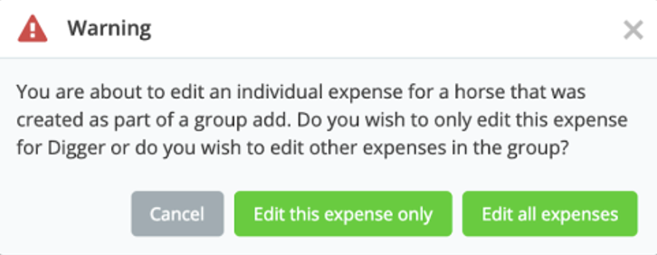 When you create new expense, you may create for multiple horses so Prism will create identical transactions against each horse. If you edit one transaction from this series, a message will show providing two options: “Edit this expense only” or “Edit all expenses”.