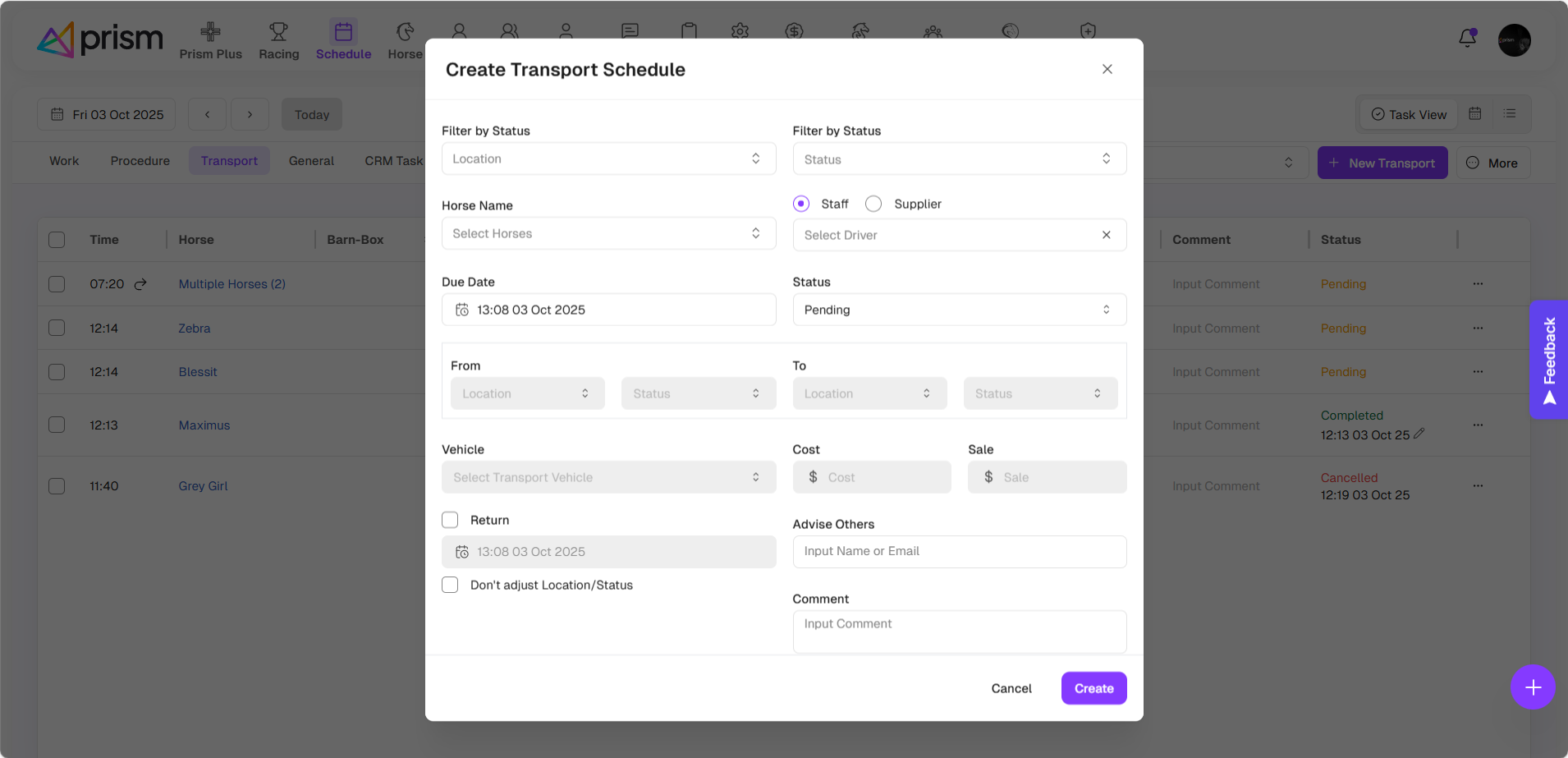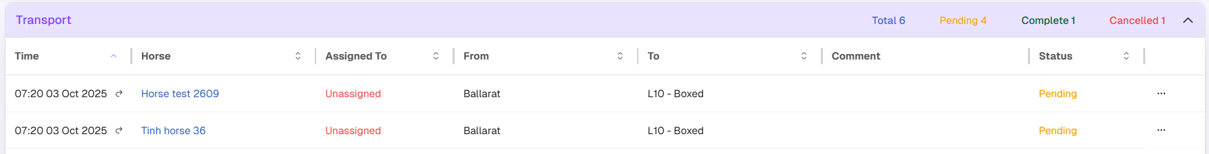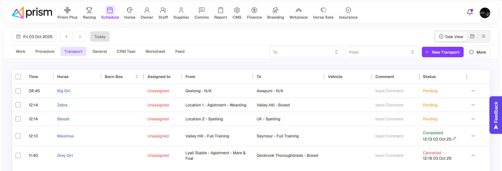 The Schedule Transport page is designed to consolidate daily transport tasks for all horses on the farm. It also provides advanced features such as bulk delete, copy task, and print.