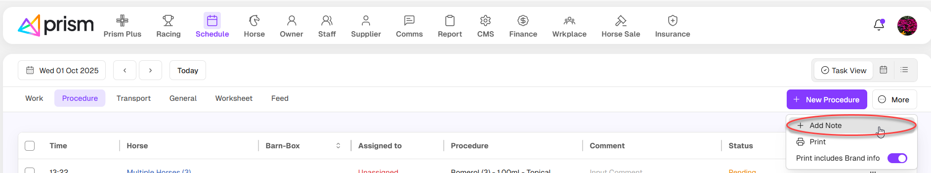 The Schedule Work page is designed to consolidate daily work tasks for all horses on the farm. It also provides advanced features such as horse linking, task copying, and grouping.