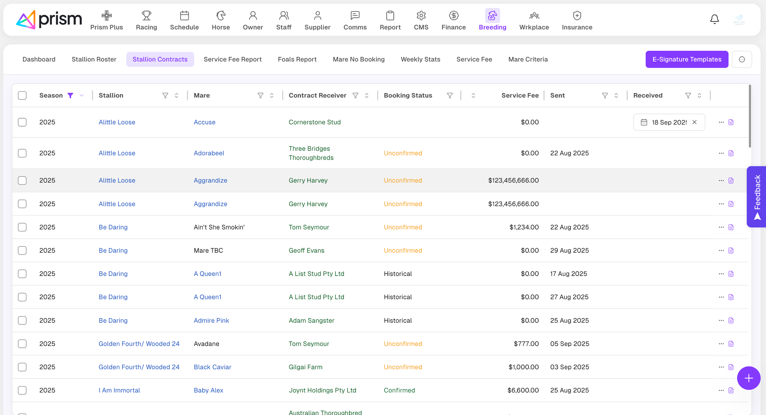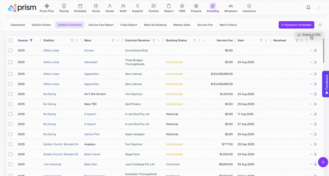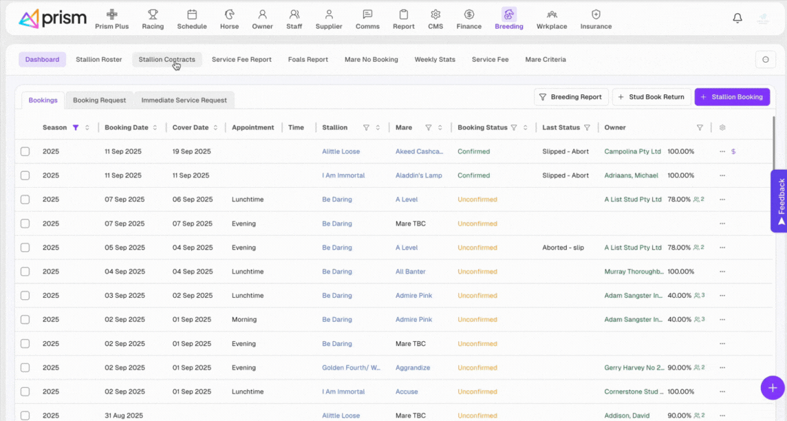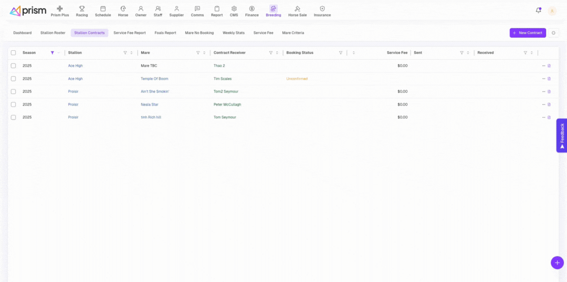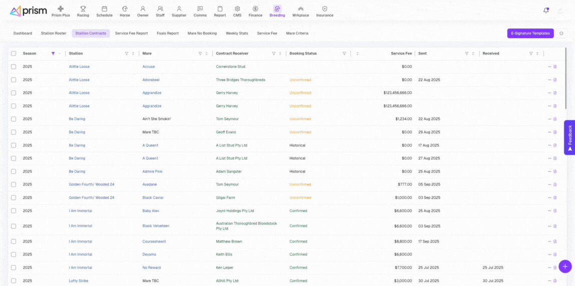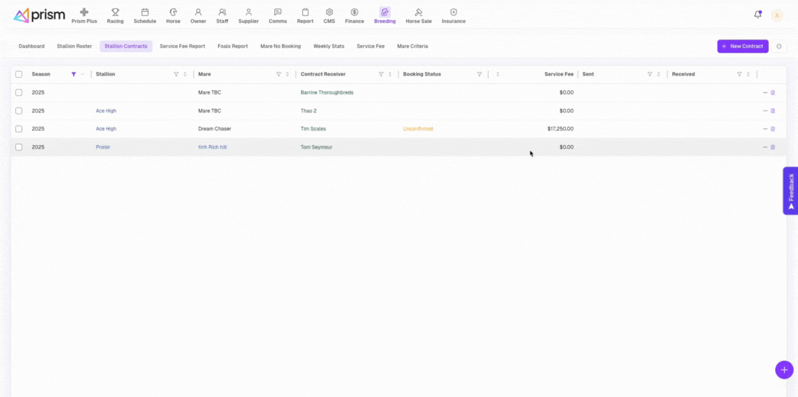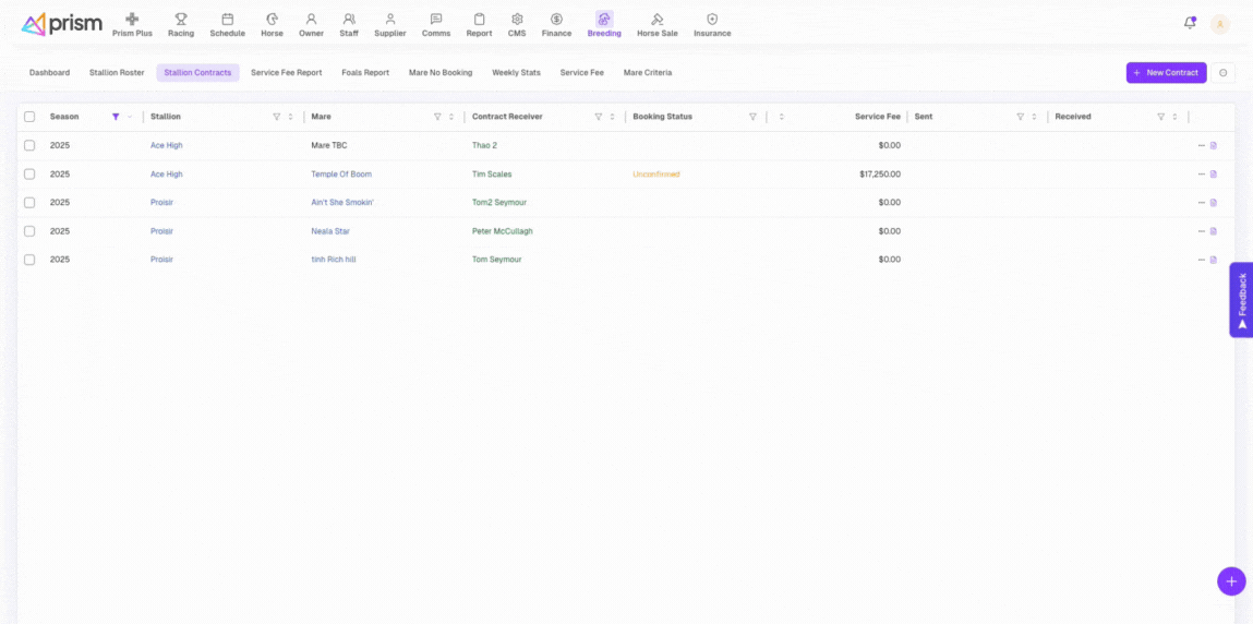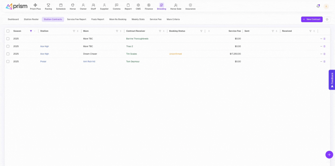 Use the filter icons to narrow by Season, Stallion, Mare, Contract Receiver, Booking Status, Service Fee, Sent/Received Date, etc.