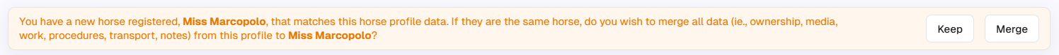 You will then be notified via app notifications and email, and offered the chance to merge the new named horse with the existing unnamed horse. You will also receive the message below on both the existing and the new horse.