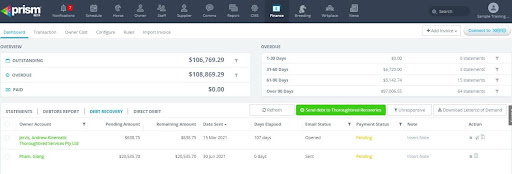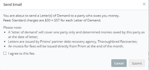 Note: There is a $30 +GST fee for each Letter of Demand sent by Thoroughbred Recoveries. This will be charged to you by Prism, monthly in arrears, for distribution to Thoroughbred Recoveries.