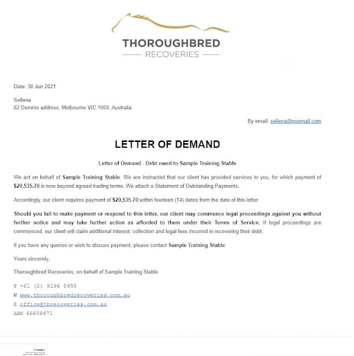 A Letter of Demand is emailed to your customer demanding payment of the selected amount overdue, within fourteen (14) days.