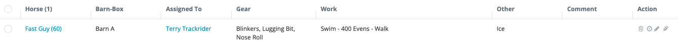 On each horse's profile, you can assign the default work gear that each horse wears or carriers during track work. Navigate to the horse profile then click the edit pencil in the Work Gear box. Select any relevant gear from the drop down Selected ...
