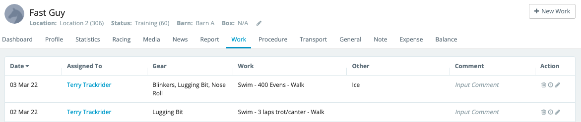 Work is also visible in each horse’s Work history as well as the rider's task list.