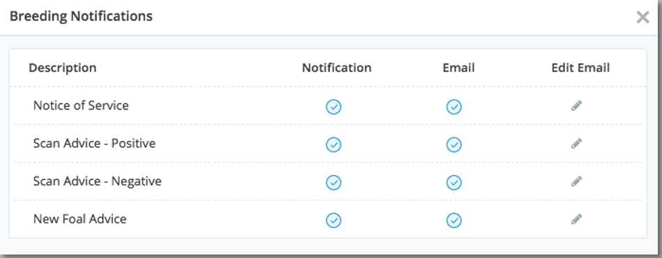 2. By default, all Breeding Notifications are disabled. You may choose to enable one, multiple or all portal Notifications and/or Email Notifications to owners.