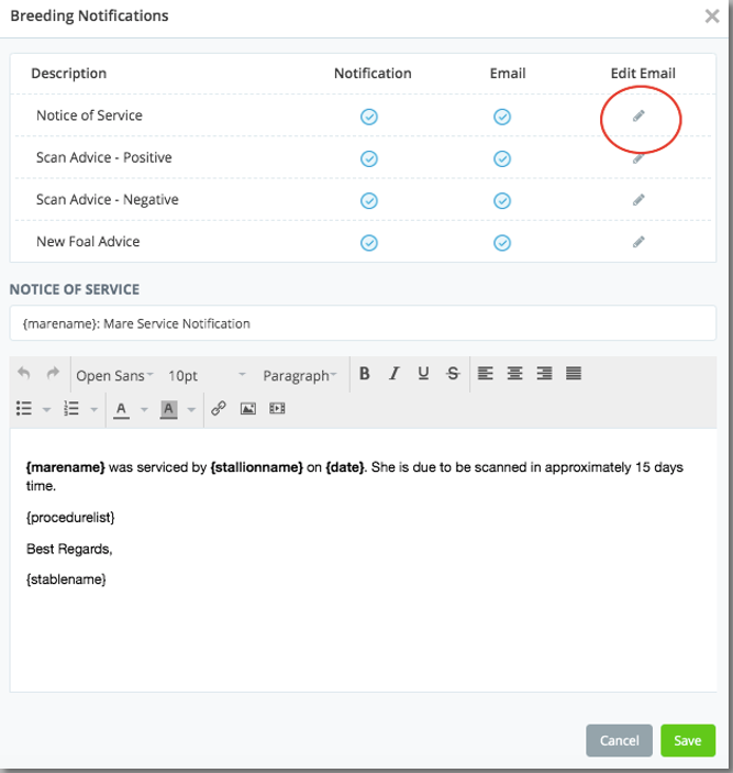 Simply tick the relevant information you would like to automatically include in the notification to mare owners.