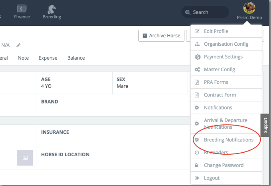 1. Login under your Prism portal's master account and navigate to Breeding Notifications via your Profile.