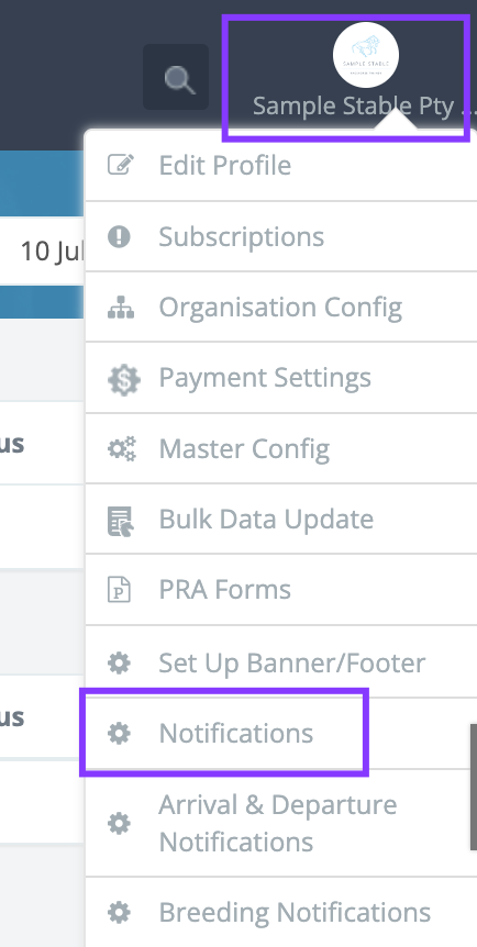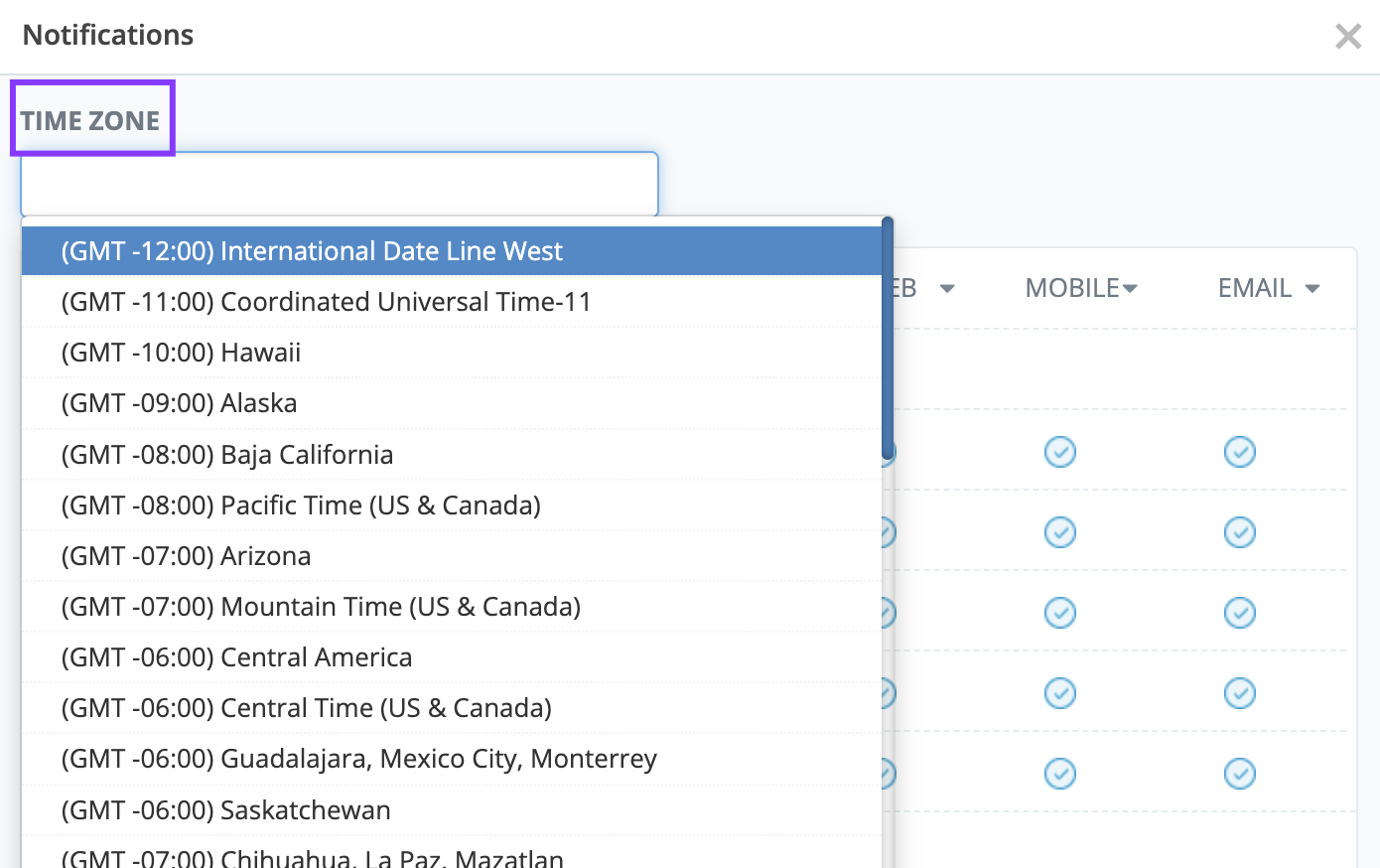 To set up your time zone and notification settings, click on your Profile in the top right of the screen, then select Notifications.