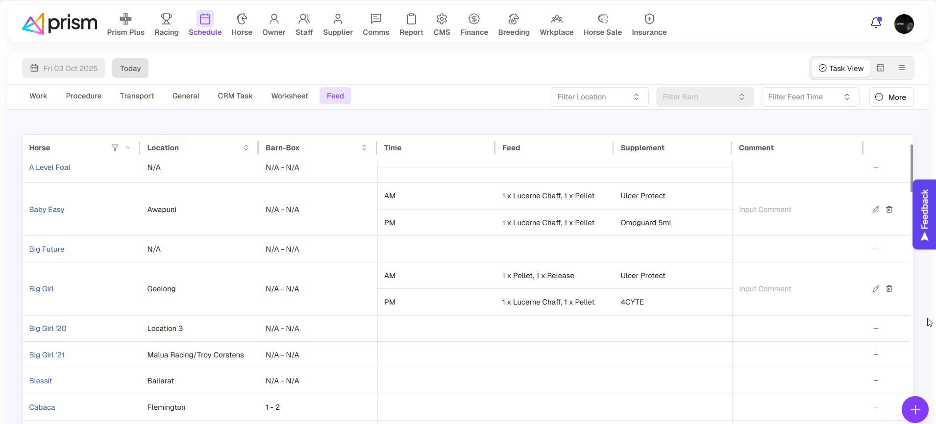 Subscribers to Prism PLUS can now maintain a Feed and Supplements master list, and maintain a feeding schedule for each horse.