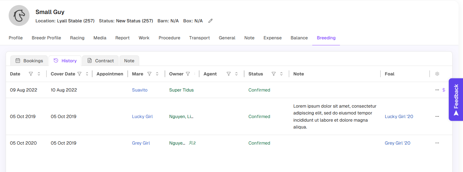 - Click on the Breeding tab, select the “History” sub-tab.