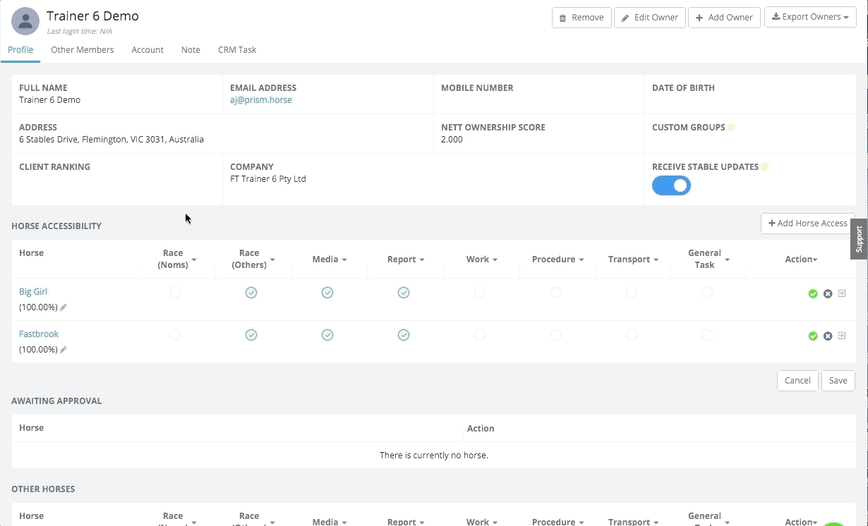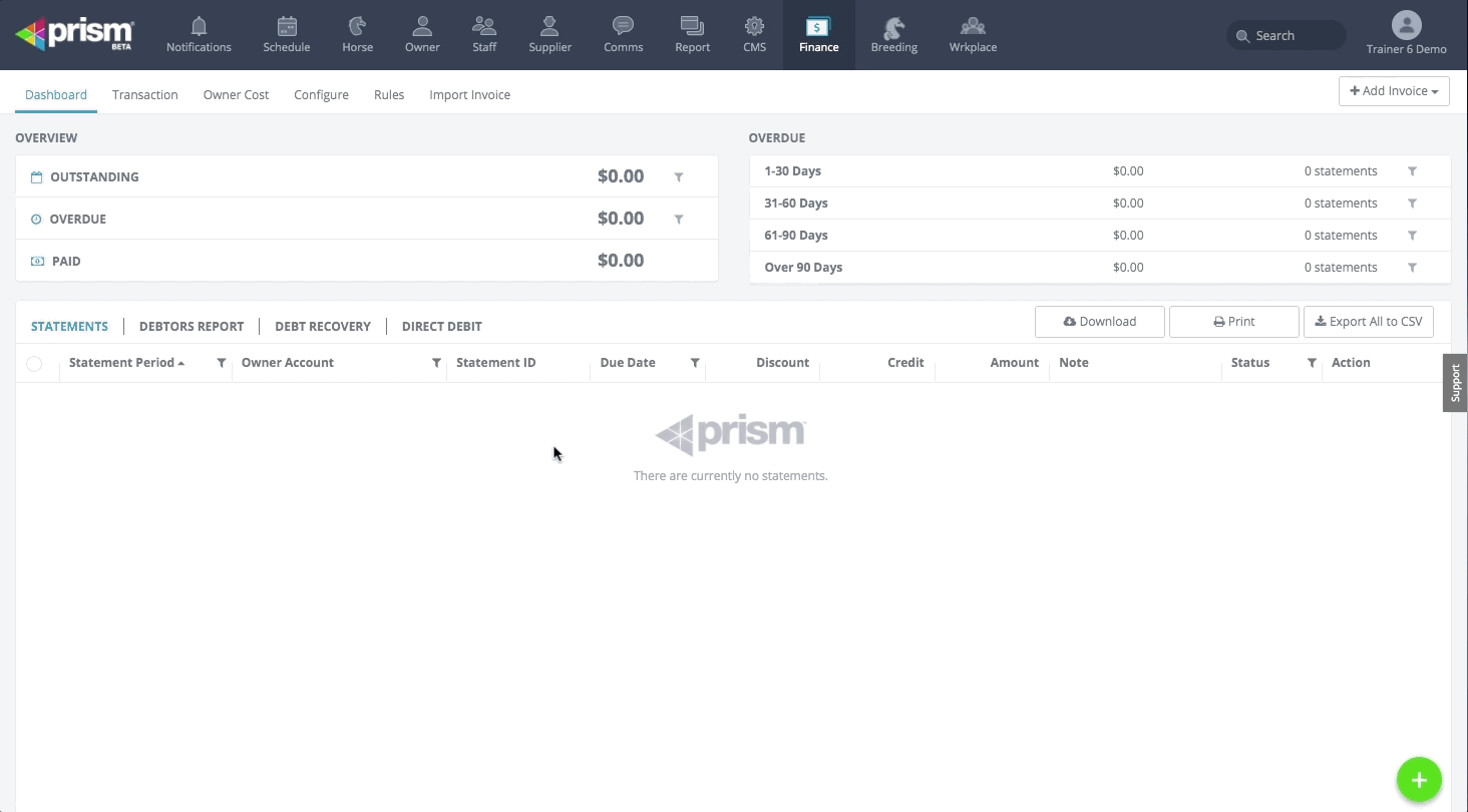 This new feature is ideal for trainers and syndicators who receive invoices from any other training, pre-training/breaking, veterinary, farrier, dentist, agistment and transport service providers, and who need to reflect these expenses in Prism in order to on-charge owners.