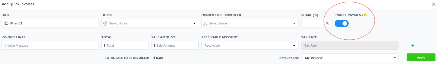 To benefit Trainers and Syndicators invoicing owners for share sales, we have implemented a "Quick Share Sale Invoices" feature, or "Quick Invoices" for short. Go to Finance > Add Invoice > Quick Invoice (instead of Single Invoice) The Add Quick ...