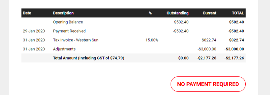 If a Customer's total amount due is less than or equal to zero (0), the button on the Statement now displays 'NO PAYMENT REQUIRED' instead of 'PAY NOW'.