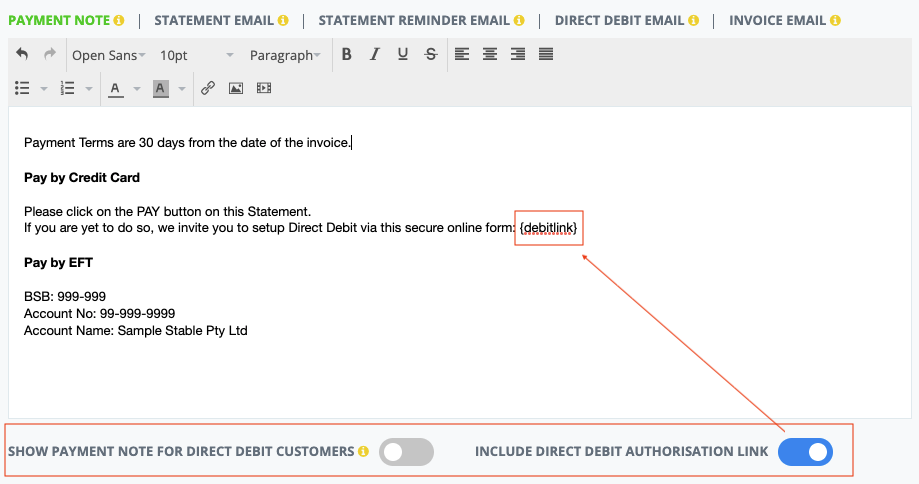 Include Direct Debit Authorisation Link - when enabled, a {debitlink] field is inserted into the Payment Note template.