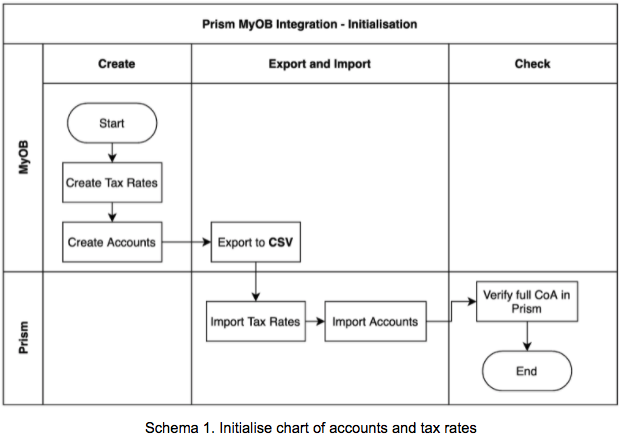 The following diagrams illustrate the processes required to initialise the MYOB and Prism integration.