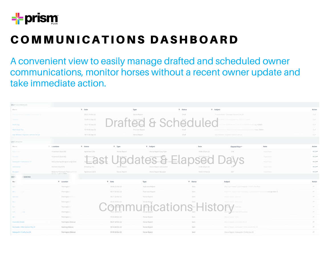 Prism Plus is the latest innovation from Prism, providing another technological leap forward for the thoroughbred racing and breeding industries. As a valued Prism customer, we want to give you the opportunity to try out this new module better manage ...