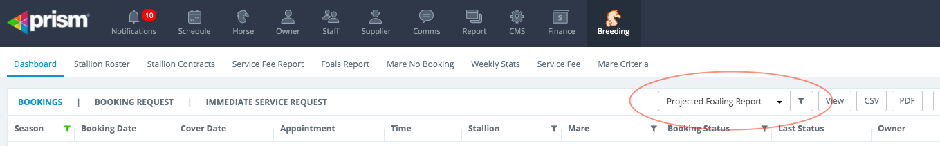 Release Date: 02 July 2020 The Projected Foaling report is now available. Go to Breeding> Dashboard. A new drop down field has been added which will eventually house several reports specifically related to broodmare and stallion farms.