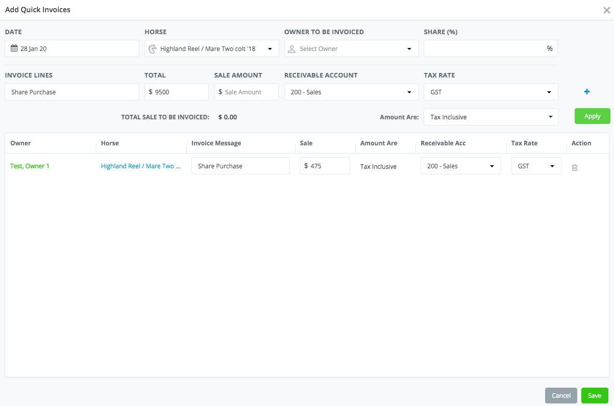 - Select horse being sold, the owner to be invoiced, and share % being sold