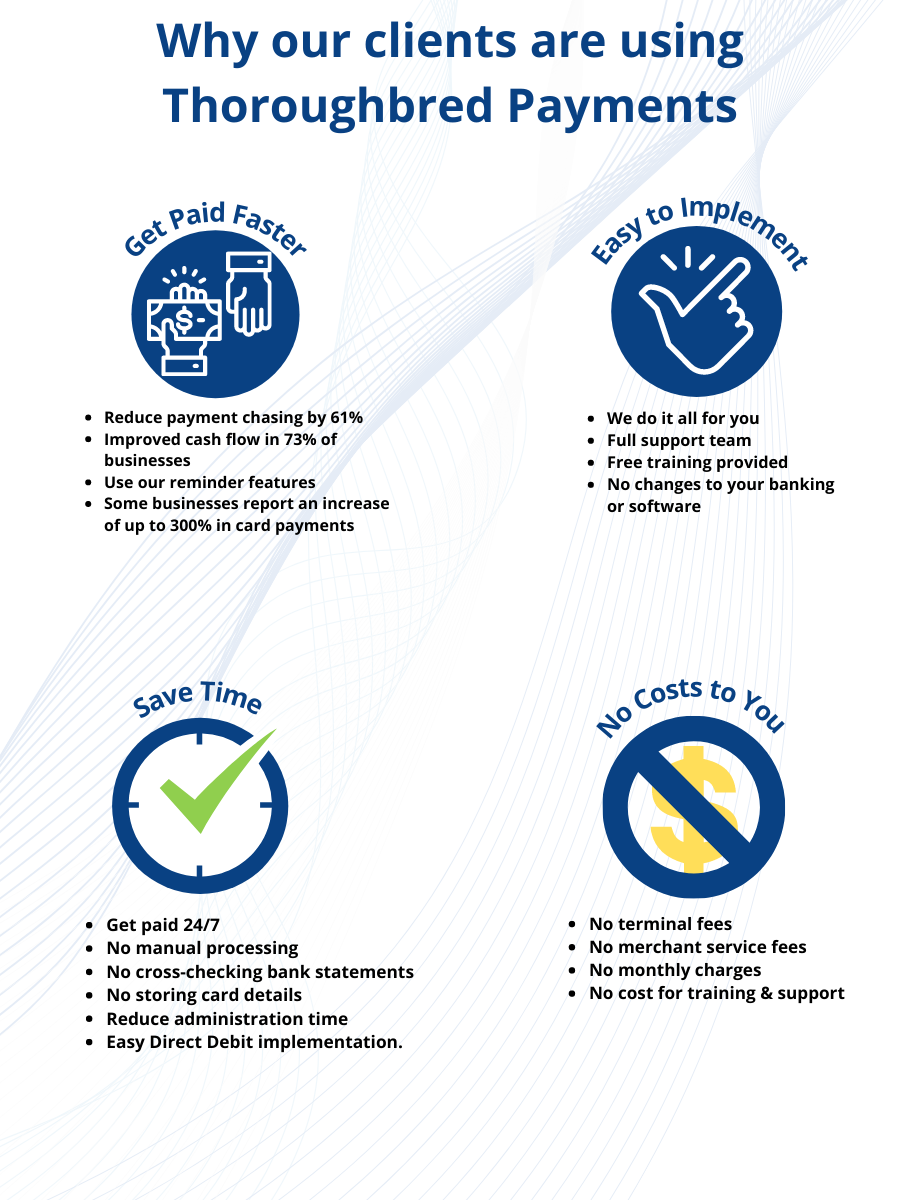 This partnership with Thoroughbred Payments is proven to improve your cash flow and reduce bad and doubtful debts.