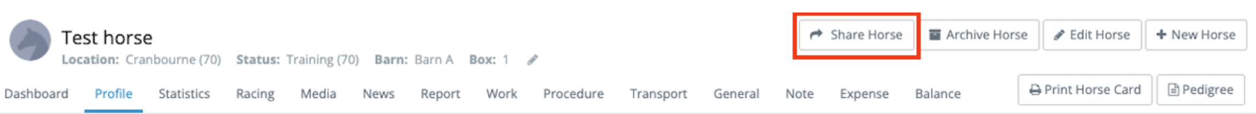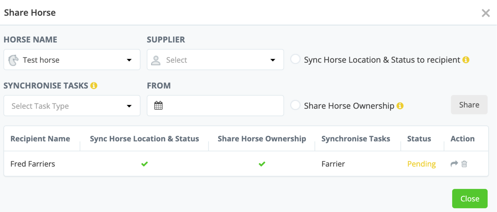 Trainers and farms who are considered the 'custodian' of a horse, have the ability to share horse(s) with supplier(s) of services.