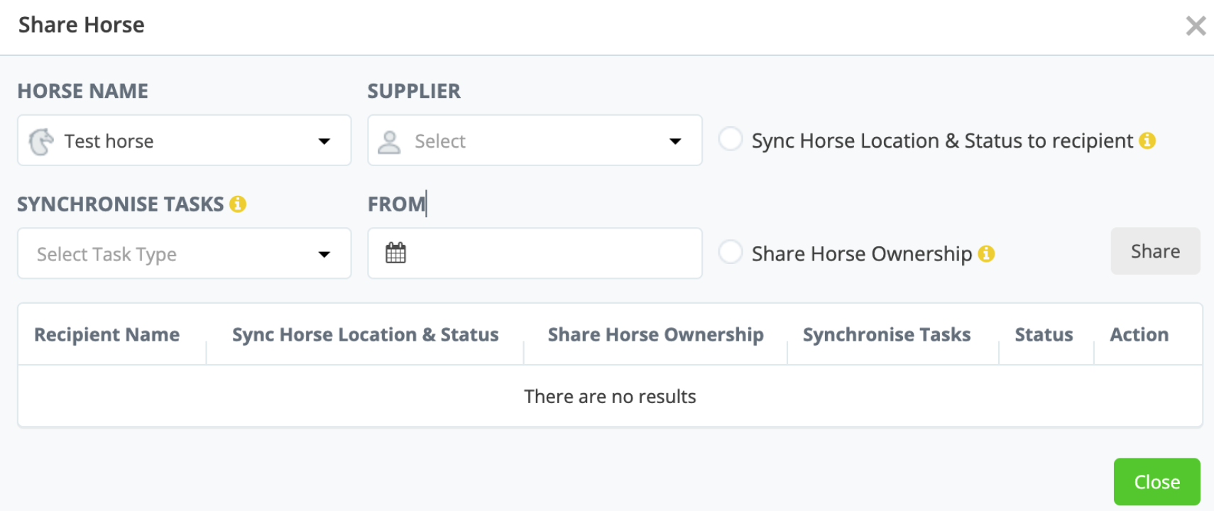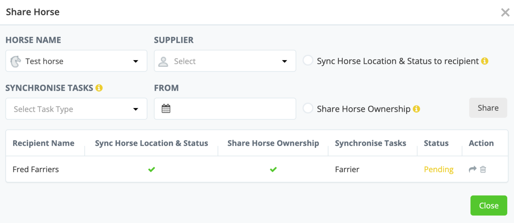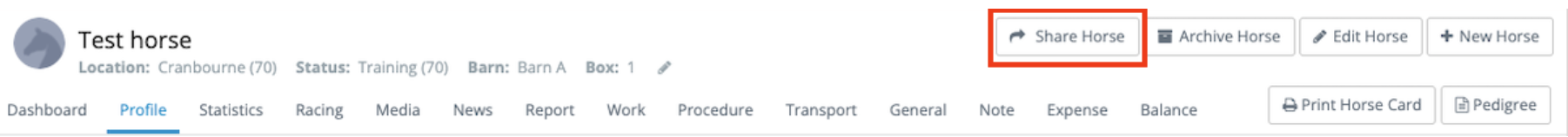 Once you have enabled sharing with another Prism account such as a provider of agistment, education, pre-training, vet, farrier or dentist services, your Prism Master Admin user account and any staff member with read-only access to Horse Profiles can selectively share one or more horses with selected suppliers.