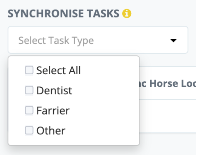 Select whether you wish to Synchronise Tasks between your Prism account and your supplier’s. You can select one or more of Farrier tasks, Dentist Tasks and/or Other tasks.