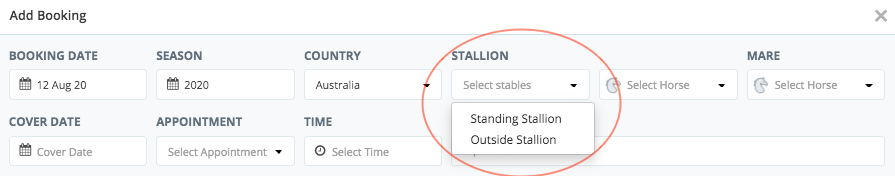 In the Add Booking pop-up window, there is now a Stallion type field that preceded the selection of a Stallion. Select either: