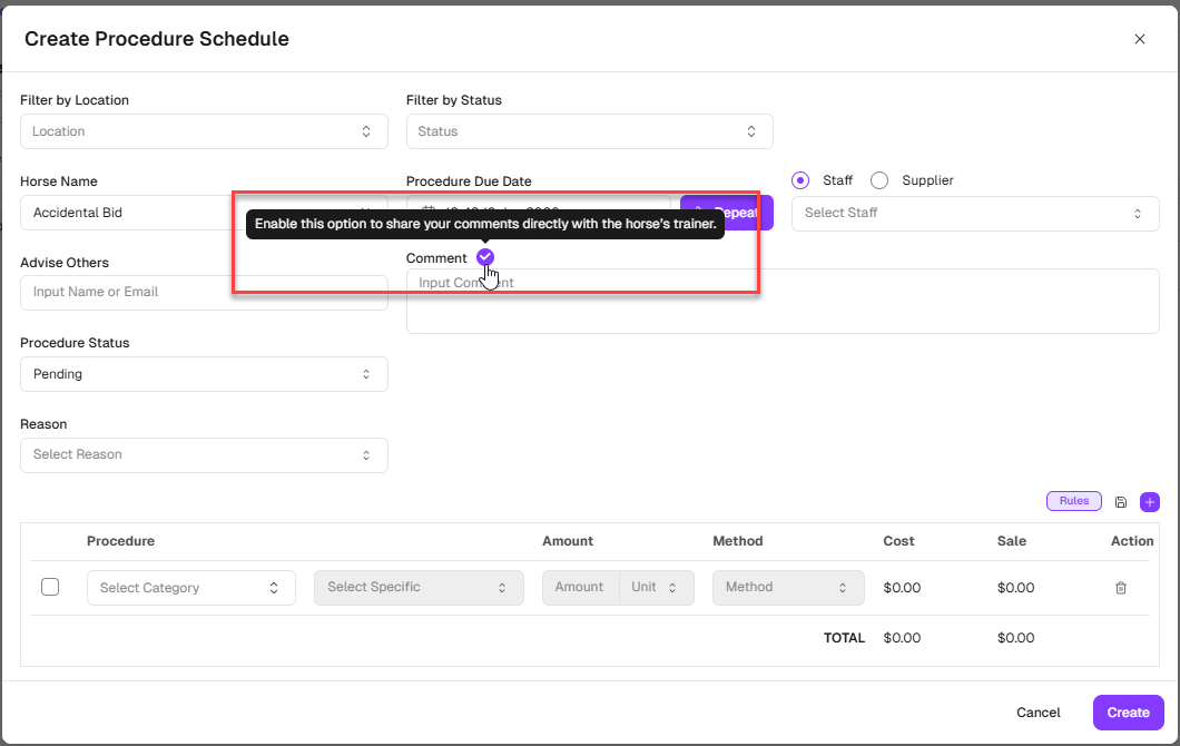 When this permission is enabled, the “Enable this option to share your comments directly with the horse's trainer.” checkbox will appear nearby Comment field in the Procedure create/edit form for that portal.