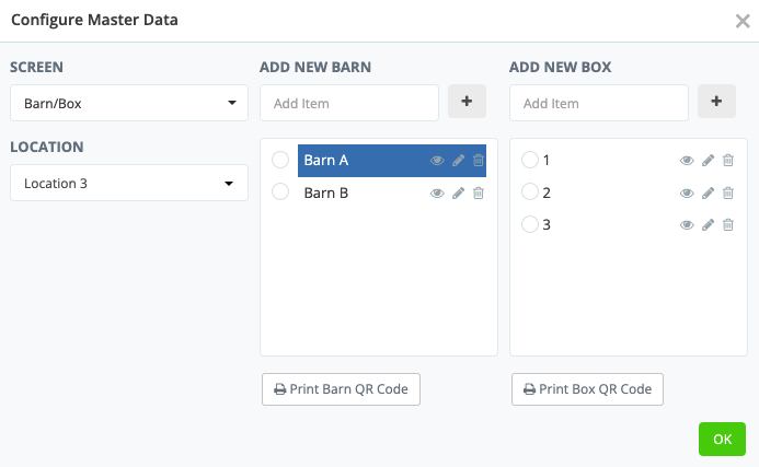These Barn and Box Cards can be printed via Master Config > Barn/Box configuration.