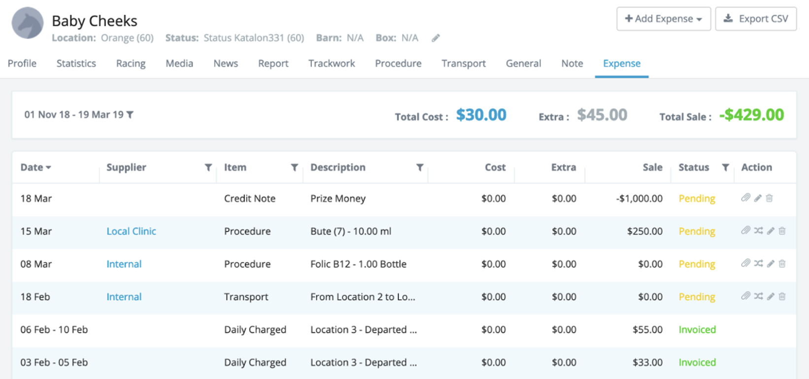 The Custom Expense feature allows you to create transactions for your horses based on specified criteria. You are able to apply expenses for horses based on: Number of Days a Horse is in a specified Location/Status, in a time period Horse arrival ...