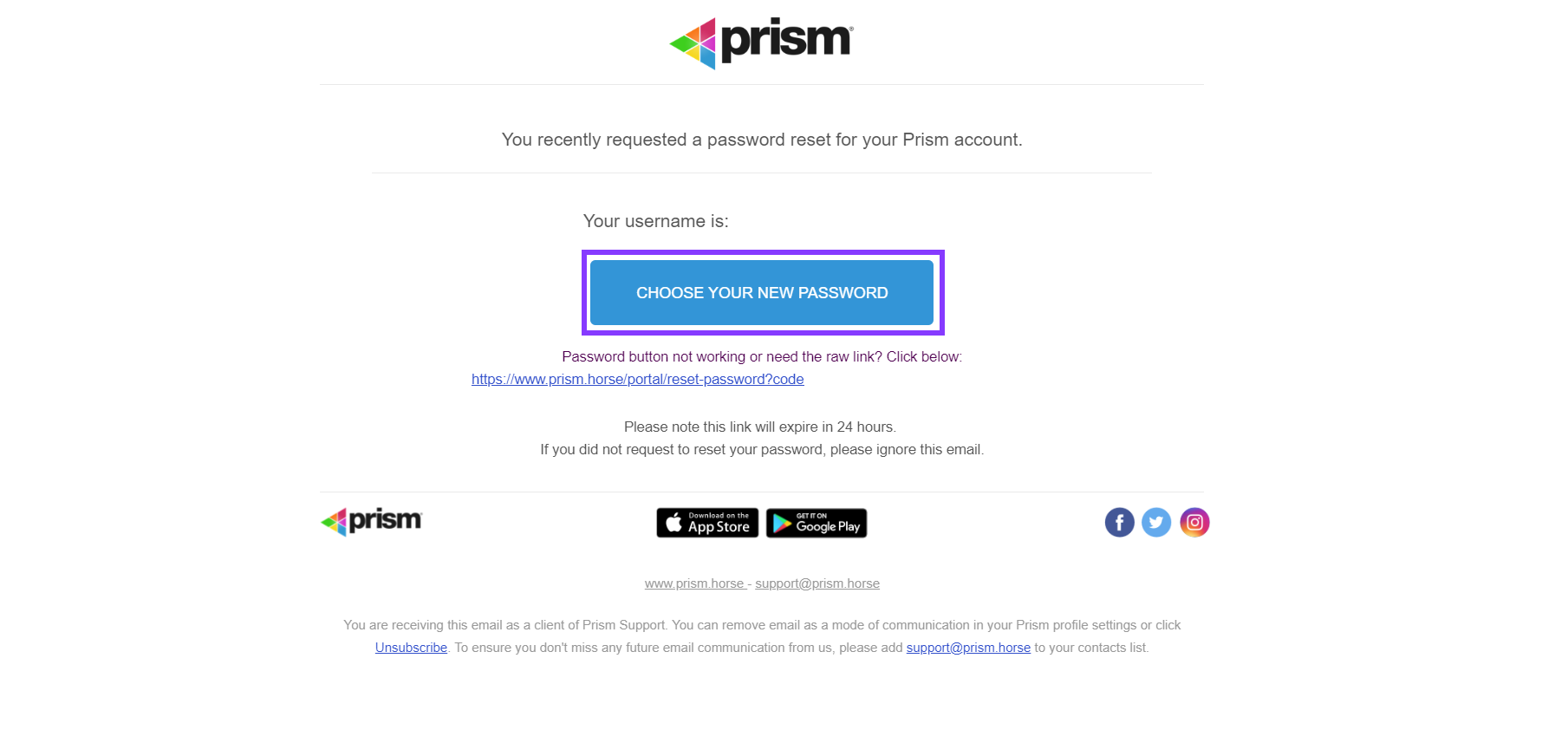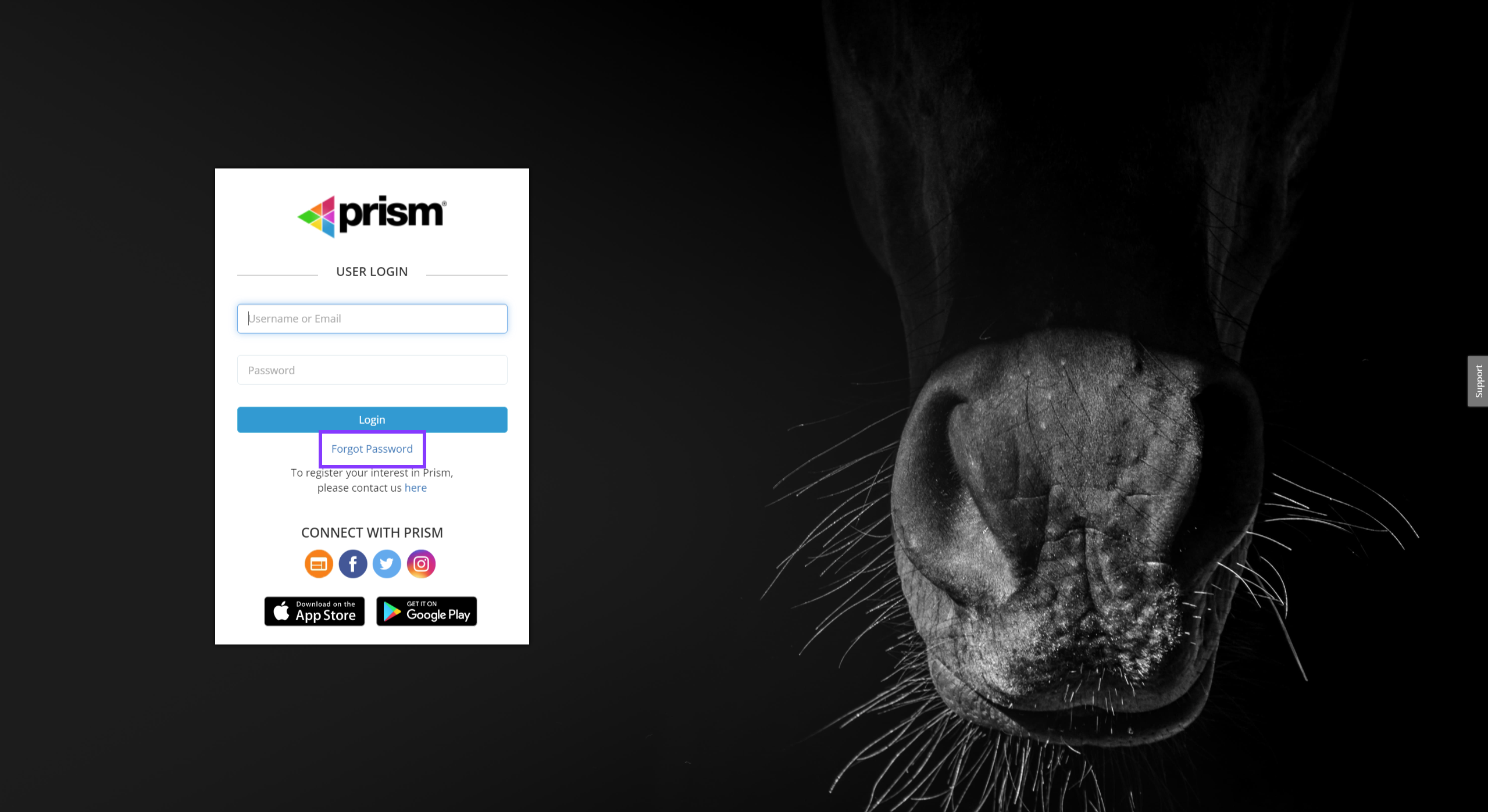 https://www.prism.horse/portal/login and clicking Forgot Password. From there, enter your email and a password reset will be sent to your Email.