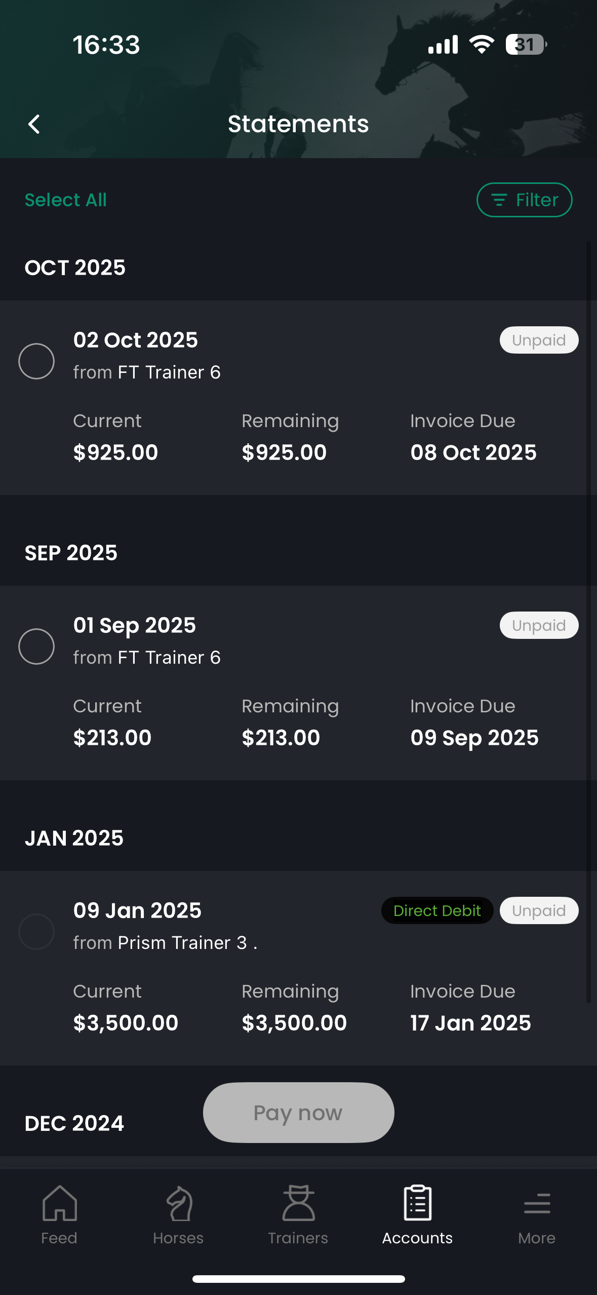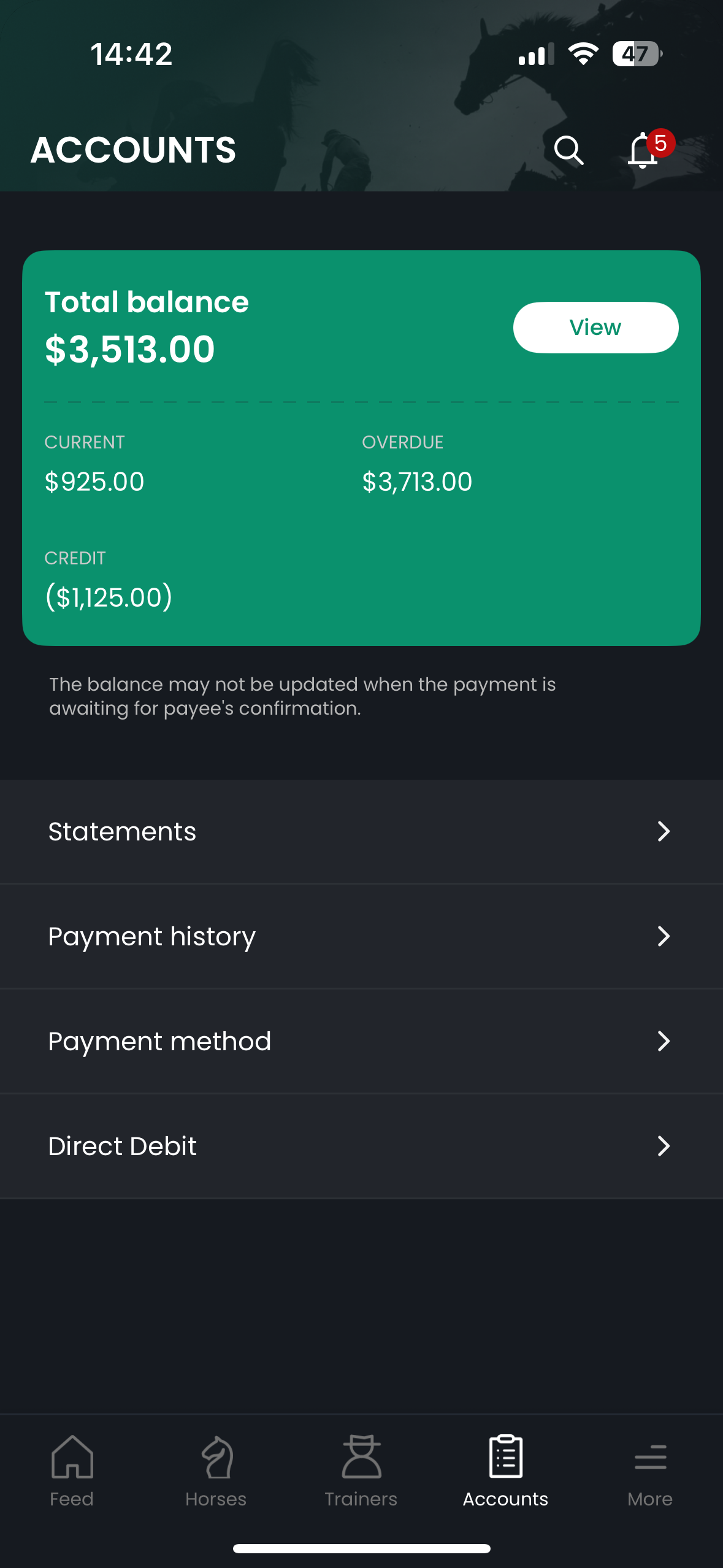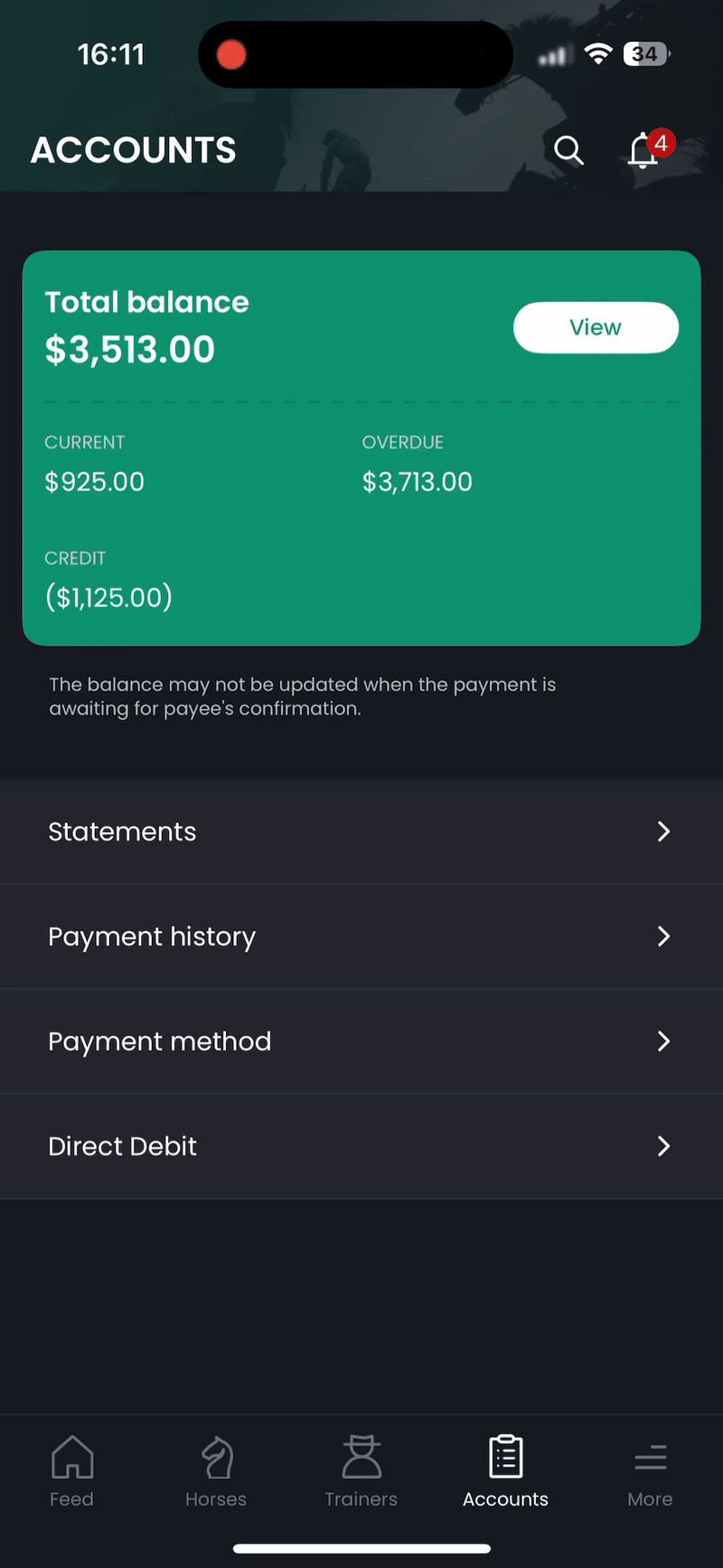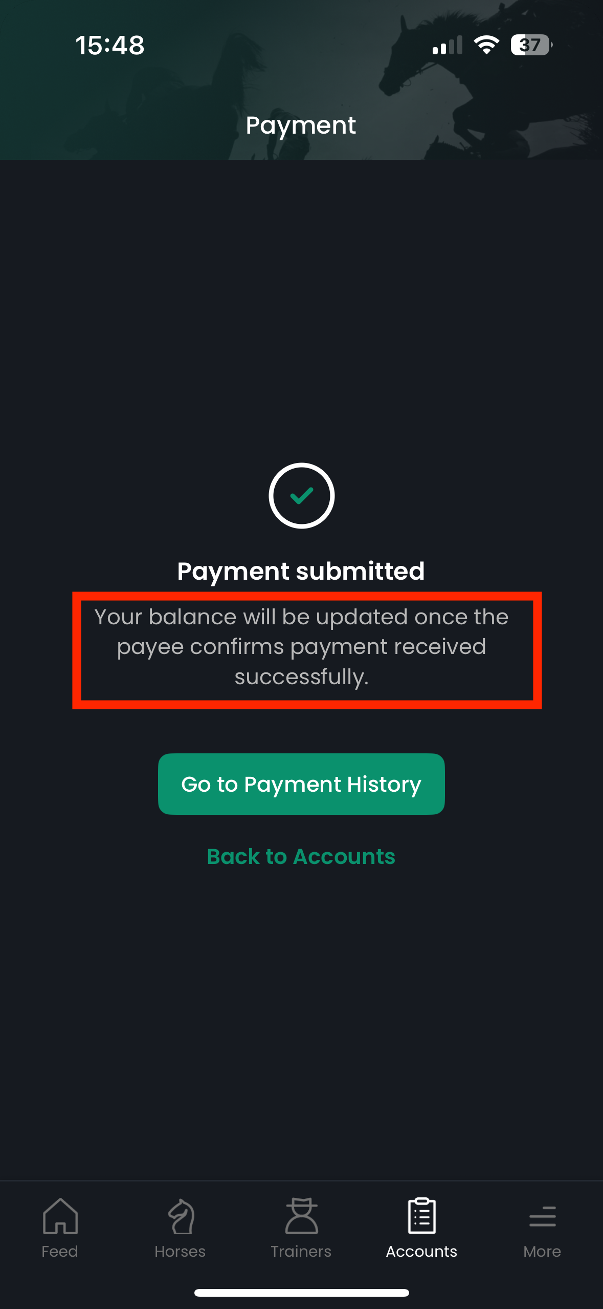 User payments will only be recorded and displayed in the Owner App after trainers or syndicators apply the payments to invoices, which is a manual process. To help users better understand this condition, Prism has added hint text on both the Payment Submitted screen and the Payment History screen.
