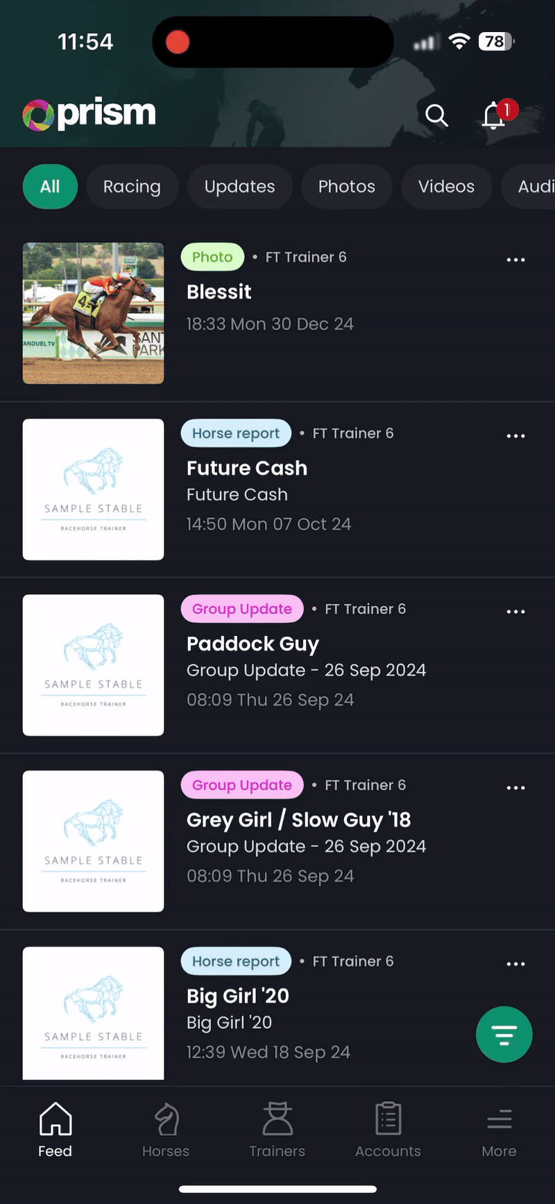 Understanding that the Feed tab can become crowded for users who own many horses, Prism has introduced a new feature that allows users to remove Races, Updates, and News from their Feed. This gives users more control over the information displayed. Removing content from the Feed does not affect its availability in the Horse Profile, so users can always revisit any removed content later.