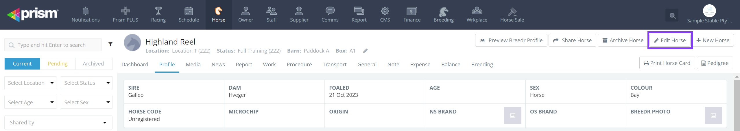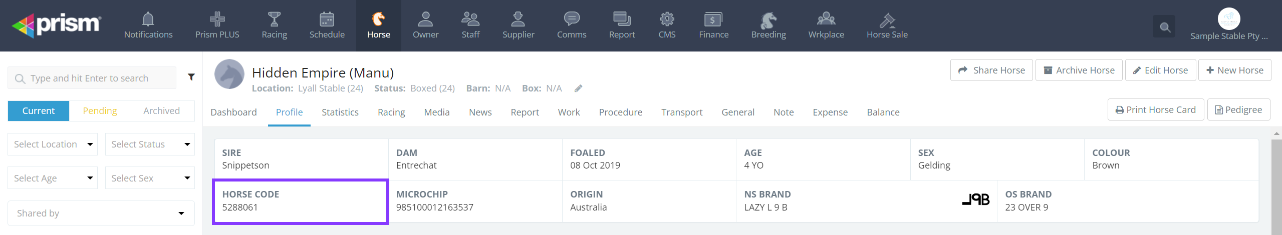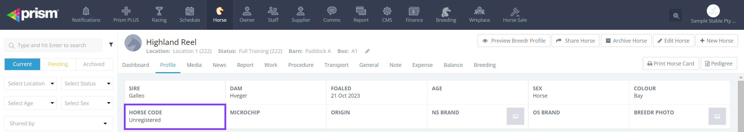 When a horse is registered or when a horse first races, new data is created at our race data providers RISA and Racing & Sport. When this data is sent to Prism, a new profile is created for the horse. These are referred to as "Registered Horses". You can tell if the horse profile is registered because it will display a number in its Horse Code field:
